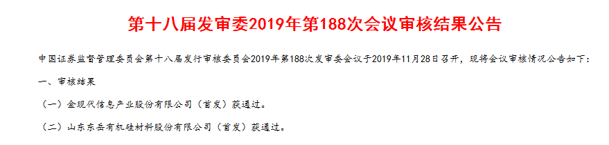 11月28日,在中國證券監督管理委員會第十八屆發行審核委員會2019年188次發審委會議上,山東東岳有機硅材料股份有限公司首發獲無條件通過。東岳有機硅將于近期登陸深圳證券交易所創業板,公開發行股票數量不超過3億股。