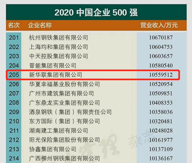 9月28日上午,中國企業(yè)聯(lián)合會(huì)、中國企業(yè)家協(xié)會(huì)在河南鄭州隆重發(fā)布2020中國企業(yè)500強(qiáng)排行榜。新華聯(lián)集團(tuán)以年?duì)I業(yè)收入1055.95億元,連續(xù)16年躋身榜單,名列2020中國企業(yè)500強(qiáng)第205位。中國石油化工集團(tuán)有限公司、國家電網(wǎng)有限公司、中國石油天然氣集團(tuán)有限公司分別以年?duì)I業(yè)收入28117.9985億元、26521.9573億元、26192.0198億元名列榜單前3位。